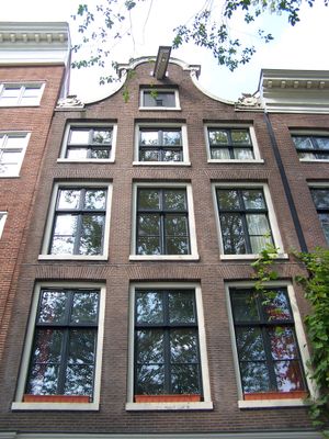 Pand met gevel onder zandstenen lijst met consoles en attiek waarin een tijger