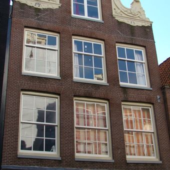 Pand met goed bewaarde ingezwenkte halsgevel met gesneden pui, dito deuren en goede roedenverdeling op de verdiepingen