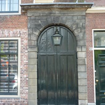 Poortje terzijde van de Marekerk. Natuurstenen omlijsting, aardige lantaarn, Rijksmonument op Oude Vest 59a-61 tussen