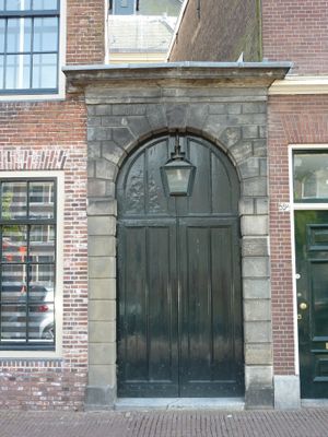 Poortje terzijde van de Marekerk. Natuurstenen omlijsting, aardige lantaarn