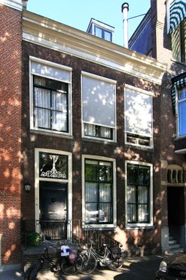 Pand met gepleisterde lijstgevel met stucdecoraties en consoles onder de kroonlijst