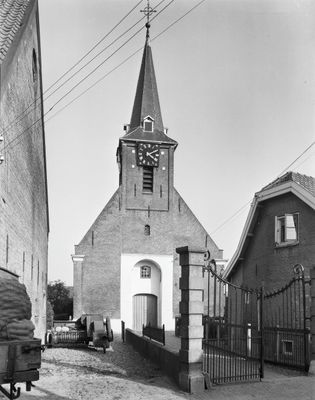 Toegangshek, voor de kerk twee geblokte hardstenen hekpijlers met ijzeren hekken, Rijksmonument op Dorpsstraat 19