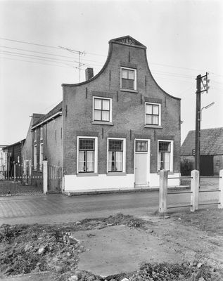 Pand met ingezwenkte gevel onder driehoekig fronton, waarin het jaartal. In de vensters schuiframen, building in Korendijk, Netherlands