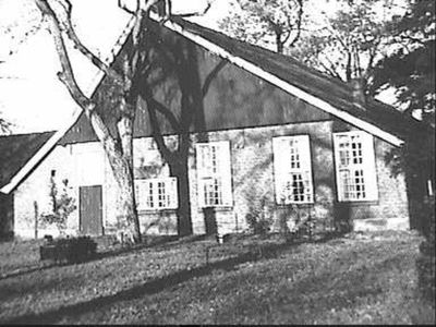 De Mans: boerderij van het hallehuistype opgetrokken in bruine baksteen onder een met zwarte muldenpannen gedekt zadeldak dat boven het uitgebouwde woonhuisgedeelte is geknikt