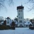 The Sprengenberg features a cemented brick hunting tower with a square floor plan and an open wooden observation post topped with a tent roof.
