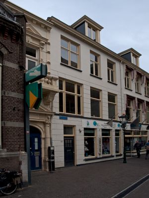 Pand onder dwars zadeldak met lijstgevel en jongere winkelpui en met restanten van de middeleeuwse stadsmuur