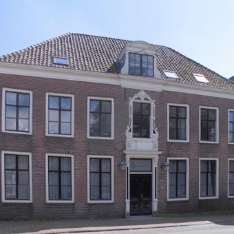 Witgepleisterd huis met rechte kroonlijst, rechthoekig grondplan en uitgebouwde kamer