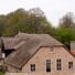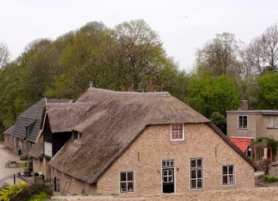 Boerderij onder rieten zadeldak. Voorgevel met vlechtingen en geblokte ontlastingsboog