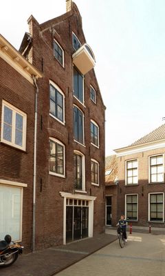 Pand onder schilddak en met in de 19e eeuw gepleisterde lijstgevel, die echter twee ankers uit de bouwtijd van het pand in de bovenhoeken bewaard heeft