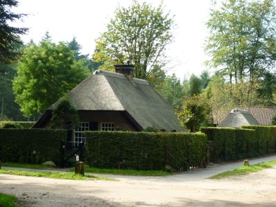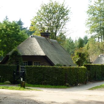 Een schaapskooi van gepotdekselde houten delen met rieten dak, mooi gelegen in het geboomte