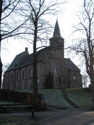 The Nederlands Hervormde Kerk features a western tower connected to an elongated nave and choir, constructed with traditional Dutch brickwork architecture.