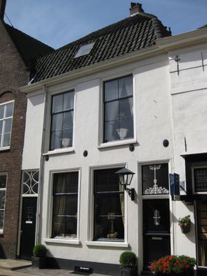 Laag huis onder zadeldak, rechte gootlijst. Poort