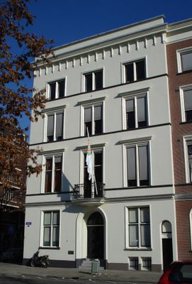 Pand, onderdeel van een reeks herenhuizen gebouwd in een gebogen rooilijn. Bakstenen lijstgevel. Balcon op consoles en met gietijzeren balustrade