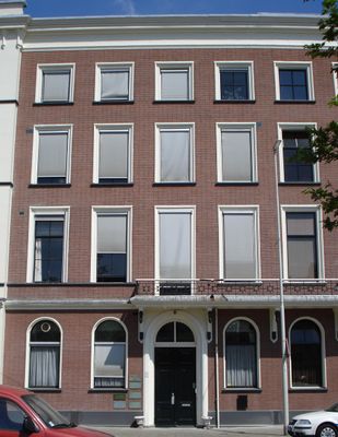 Pand, onderdeel van een reeks herenhuizen gebouwd in een gebogen rooilijn. Bakstenen lijstgevel. Balcon op consoles en met gietijzeren balustrade