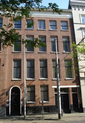 Pand, onderdeel van een reeks herenhuizen gebouwd in een gebogen rooilijn. Bakstenen lijstgevel. Balcon op consoles en met gietijzeren balustrade