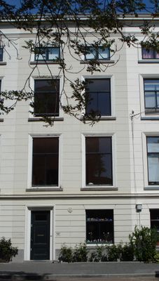 Pand met drie verdiepingen. Houten kroonlijst, rijk geprofileerd, waaronder in het fries panelen