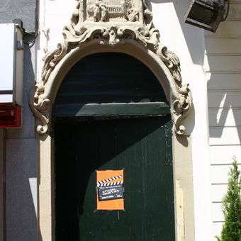 Poortje met zandstenen boog en versiering in Lodewijk XV-stijl, in een cartouche een reliëf voorstellende een wijnvat met kinderfiguren