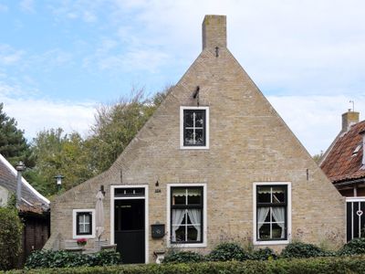 Pand met gecementeerde gevel, zesruitsvensters en houten goot op blokken onder aan de voorzijde afgewolfd zadeldak, building in Schiermonnikoog, Netherlands