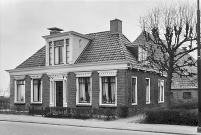Pand met omlijste ingang, verdieping met zesruitsvensters en forse kroonlijst onder schilddak