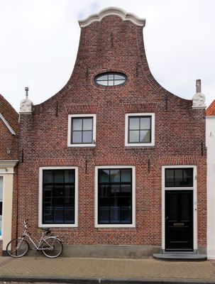 Pand met verdieping en vlieringverdieping onder zadeldak tegen slanke klokgevel met aanzetkrullen en gebeeldhouwde kuiflijst