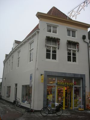 Laat middeleeuws pand met mooi, hoog schilddak en gepleisterde gevel onder rechte lijst