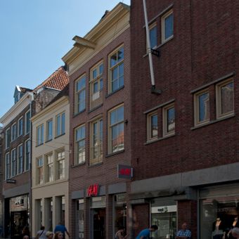 Pand met geverfde lijstgevel, licht getoogde strekken, hardstenen raamdorpels, hijsbalk en jongere winkelpui, building in Zwolle, Netherlands