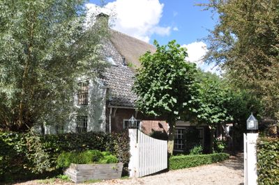 Boerderij. gepleisterd dwarshuis met riet gedekt, geschoren linden voor het huis