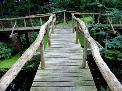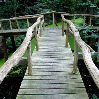Fraeylemaborg, houten brug op jukken over slotgracht, voorzien van een opklapbaar gedeelte in het midden en ijzeren leuningen