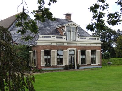 Boerderij onder grotendeels rieten dak met klein voorhuis met zesruitsvensters, ook in het woongedeelte van de schuur