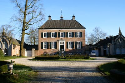 Strijdhoef: toegang tot het omgrachte voorplein van het huis, bestaande uit een dam met ijzeren paaltjes en kettingen en een bakstenen poortgebouw. Kasteel de Strijdhoef