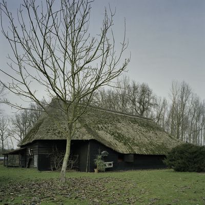Eenvoudig dorpshuis met dwars zadeldak, twee haaks daarop staande achtergebouwen met topgevels en zadeldaken