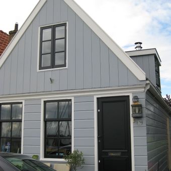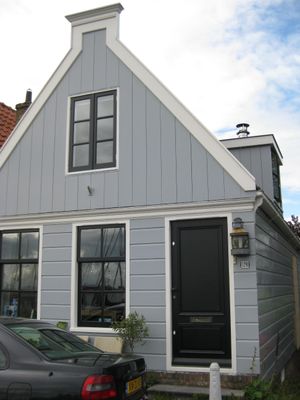 Houten huis. Puntvormig voorschot. Goede pui, en puilijst, goede roedenverdeling. Gepotdekselde zijwanden