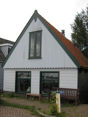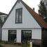 Houten huis. Puntvormig voorschot. Goede pui, en puilijst, goede roedenverdeling. Gepotdekselde zijwanden