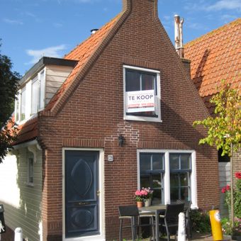 Houten huis, gepotdekselde zijwanden en puntvormig voorschot. Goede pui en puilijst