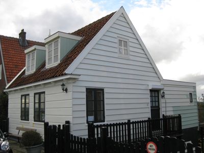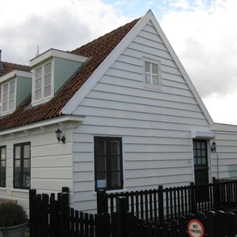Houten huis, gepotdekselde zijwanden en puntvormig voorschot. Goede pui en puilijst