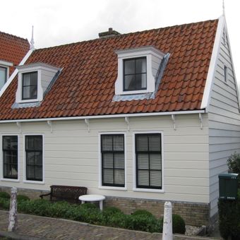 Houten huis, gepotdekselde zijwanden en puntvormig voorschot. Goede pui en puilijst