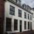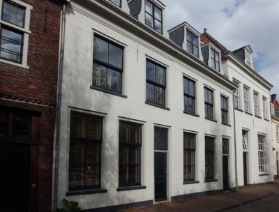 Woonhuis met rechte kroonlijst. 19e-eeuws voorkomen. In de vooruitspringende hoek een spiongat