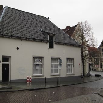 Laag pand met hoog zadeldak en gepleisterde lijstgevel, building in Bergen op Zoom, Netherlands