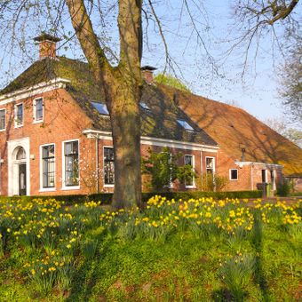 Grote boerderij met woonhuis met omlijste ingang en grote aan de voorzijde afgewolfde kap, farmhouse in Appingedam, Netherlands