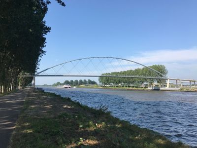 The Nigtevecht bicycle bridge spans 600 meters across the Amsterdam-Rhine Canal, featuring a 5-meter-wide deck for cyclists and pedestrians to cross safely.