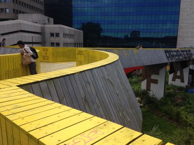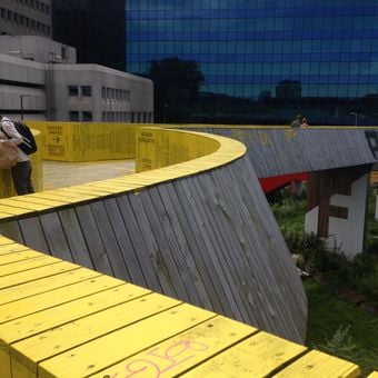 The bridge integrates personal messages from contributors engraved on wooden planks, creating a tangible connection between citizens and urban infrastructure.