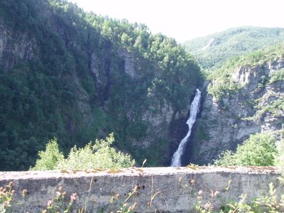 Two waterfalls cascade down opposite sides of the steep Stalheimskleiva road, with Stalheimsfossen dropping 126 meters on one side and Sivlefossen falling 142 meters on the other.