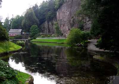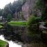 The landscape of Ravnedalen features a combination of lakes, cliffs, waterfalls, and grassy areas surrounded by tall spruce trees and exotic plants.