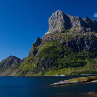 The Hornelen mountain rises 860 meters above the Frøysjøen strait, forming a vertical cliff face that drops directly into the Norwegian fjord waters below.