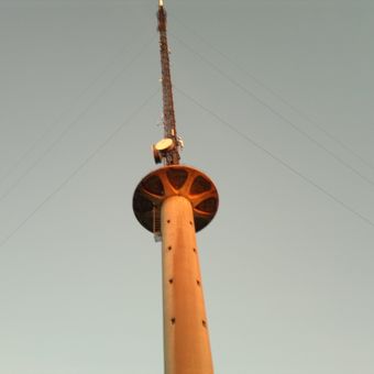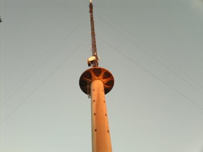 The structure employs a hybrid design that incorporates both guyed support systems and a concrete base, distinguishing it from standard telecommunications towers.