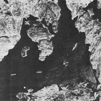During World War II, the German battleship Bismarck anchored in Grimstadfjord on May 21, 1941, marking a notable event documented through aerial reconnaissance.