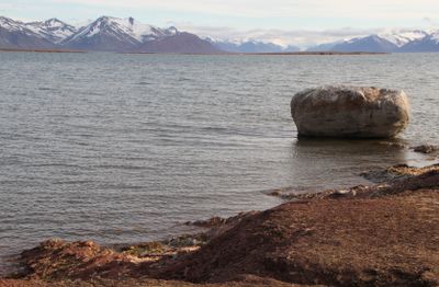 Red sandstone cliffs from the Devonian period line the fjord near Bockfjorden, where small hot springs indicate past volcanic activity.