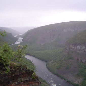 The canyon begins at Lake Virdnejávri, created by the 145-meter Altademningen dam, and descends from the Finnmarksvidda plateau to the river level.
