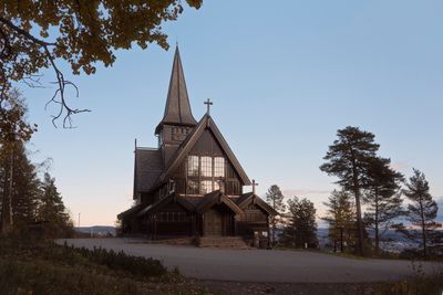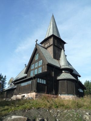The wooden chapel features traditional Norwegian architectural elements with a paneled construction and dragestil wood carvings throughout its exterior and interior design.