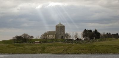 The Church of Avaldsnes is a stone building standing on a hilltop beside the Karmsundet strait, featuring thick walls, pointed arches, and a prominent tower visible from the sea. The structure combines sturdy construction with vertical design and shapes the landscape of this coastal area.